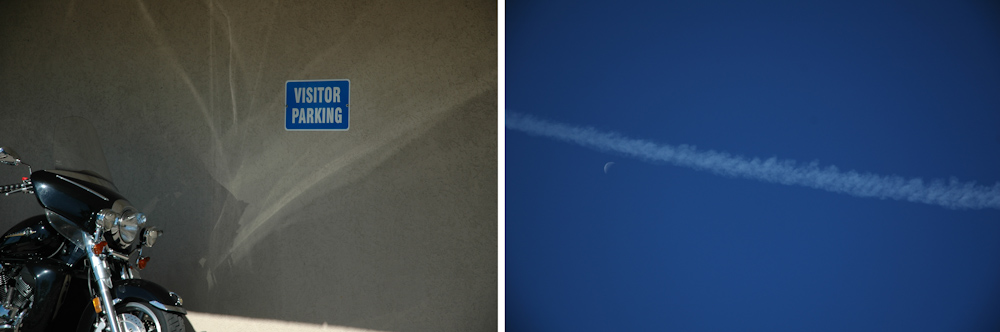 As an example, the opening image shows a motorcycle and a sign that reads “VISITOR PARKING” and is paired with an image of a jetstream and a half moon in a deep blue November sky (the sky is never bluer than in November). The sky is a very similar colour to the blue of the sign. So we’re going on a journey and it’s not entirely earthbound.